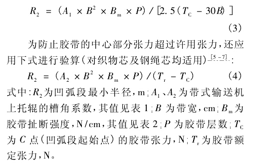 由式1可計算得出凹弧段的最小半徑。但是當膠帶的張力過低時,膠帶的邊緣處有可能產生皺曲,將無法保證皮帶輸送機的安全運行,因此需對該半徑值進行必要的校核。鑒于目前國內尚無成熟的計算公式可循,建議采用美國輸送設備制造商協會聯合會推薦的公式對最小半徑進行驗算,以保證膠帶具有足夠張力,避免在凹弧段處的膠帶邊緣出現零張力'對織物芯膠帶,用下式進行驗算: